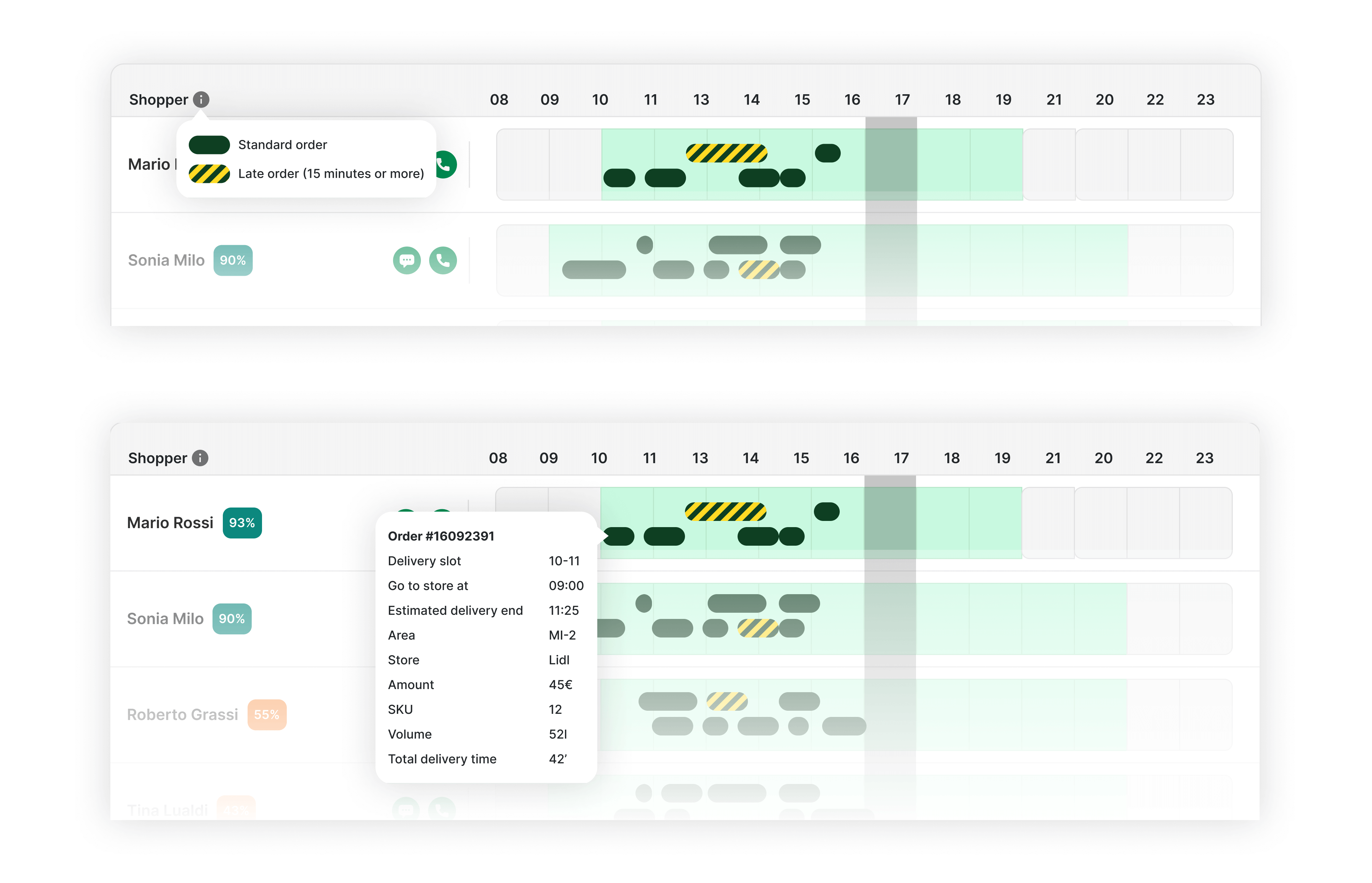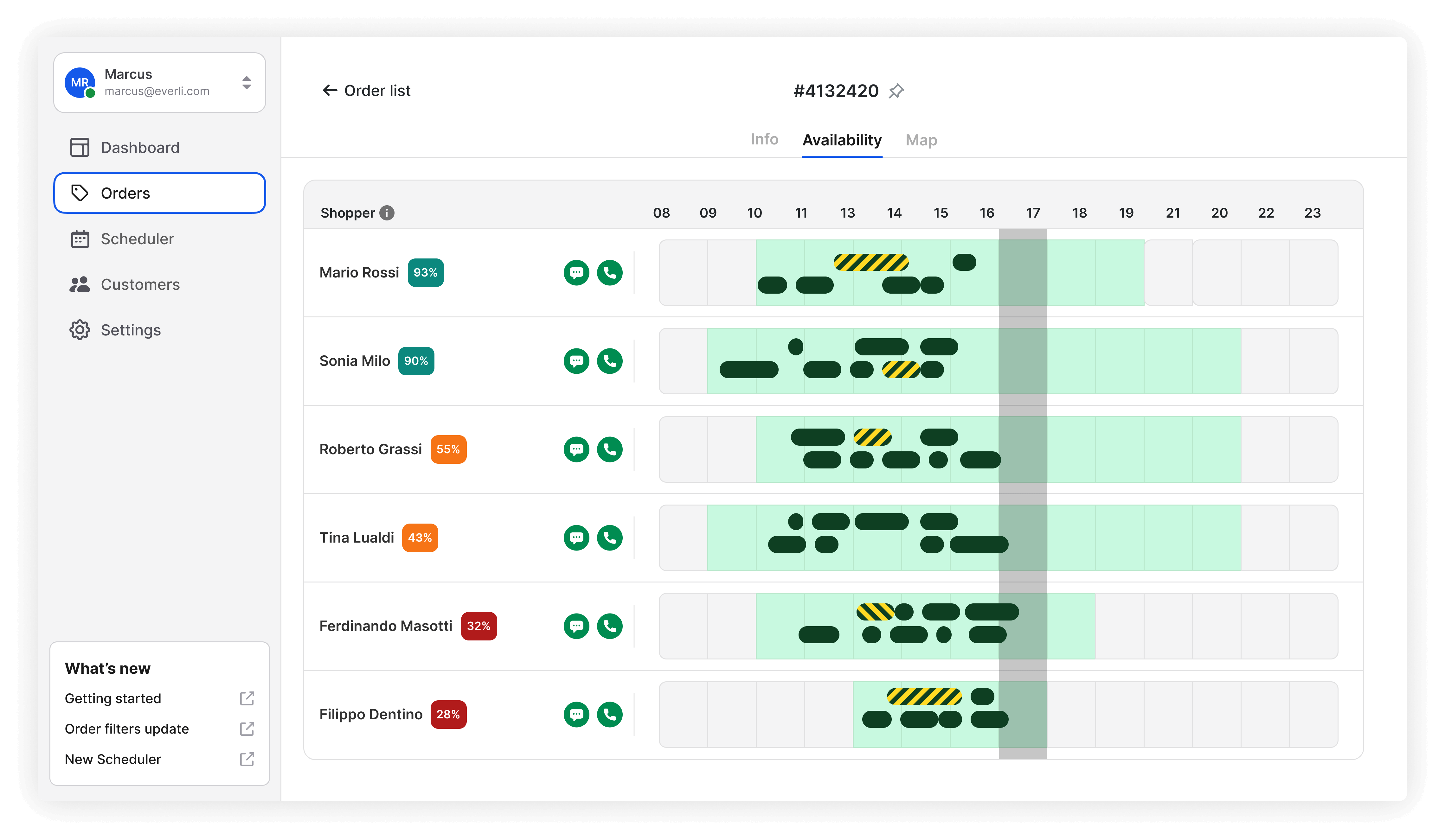 Key features like real-time shopper geolocation, availability and performance indicators, and direct contact options help agents step in when automatic assignment fails. They can quickly spot active shoppers—even outside the delivery area—assess reliability, and reach out with incentives to secure manual order acceptance, reducing delays and maintaining service continuity.